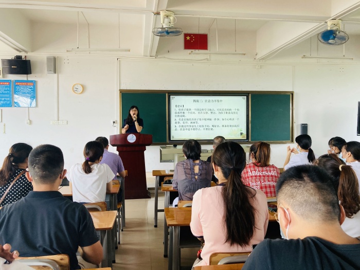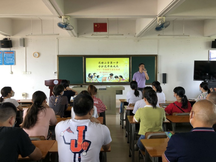梁雪芳副主任為家長(zhǎng)們作開學(xué)前的指引性講座,一年級(jí)全體家長(zhǎng)參與家長(zhǎng)培訓(xùn)會(huì)議。為幫助孩子和家長(zhǎng)消除初入小學(xué)的緊張和焦慮,盡快適應(yīng)小學(xué)的學(xué)習(xí)和生活,梁副主任從幼兒升小學(xué)必須過好的五關(guān):心理關(guān)、學(xué)習(xí)關(guān)、生活關(guān)、物質(zhì)關(guān)、交際關(guān),向家長(zhǎng)們?nèi)娴亟榻B了一年級(jí)新生開學(xué)前的準(zhǔn)備工作、學(xué)生一日常規(guī)指引、學(xué)生良好行為習(xí)慣和學(xué)習(xí)習(xí)慣培養(yǎng)指引、學(xué)生安全意識(shí)培養(yǎng)指引等其他方面,并對(duì)校園防疫工作和學(xué)生衛(wèi)生防疫要求進(jìn)行了細(xì)致清晰的講解。隨后,梁容根校長(zhǎng)作總結(jié)發(fā)言,給家長(zhǎng)們指明了家庭教育的方向。