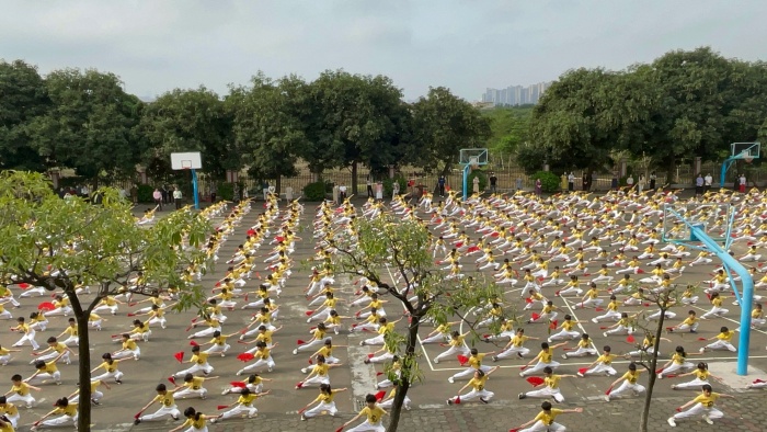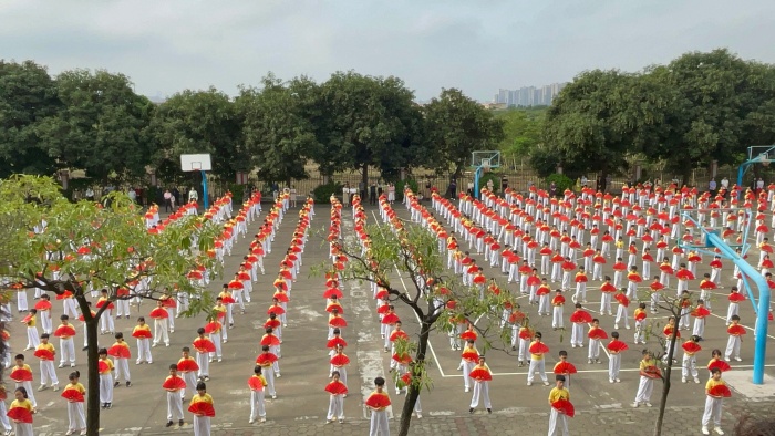 隨著音樂聲響起,同學們快速地整裝列隊來到操場上,家長們也一起前往,感受西小的陽光大課間。伴著輕快的樂曲,孩子們的扇操盡顯英氣,出腿、揮扇,干脆利落,氣勢如虹。健美操活力四射,處處散發(fā)著青春的朝氣。八段錦剛?cè)嵯酀徽幸皇饺缧性屏魉?,每個人都展示出西小學子健康向上、不屈不撓的精神。家長們紛紛露出贊賞的眼神,給予高度認可。