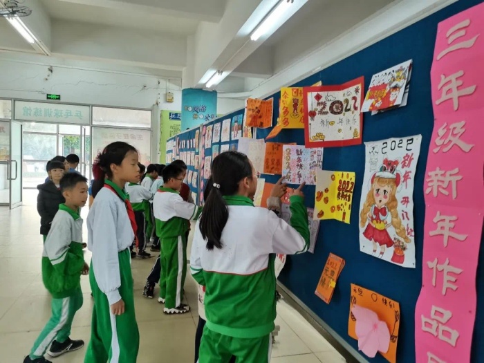 活動前期,在美術老師的帶領下,各班同學動手認真繪制年畫、新年賀卡、手抄報及新年詩文等。這些畫作正吸引著同學們紛紛前來觀賞,校園里充滿了濃濃的節(jié)日氣氛。