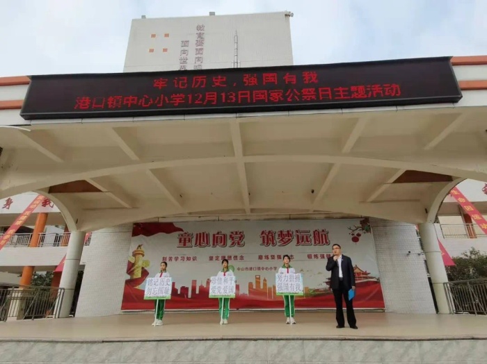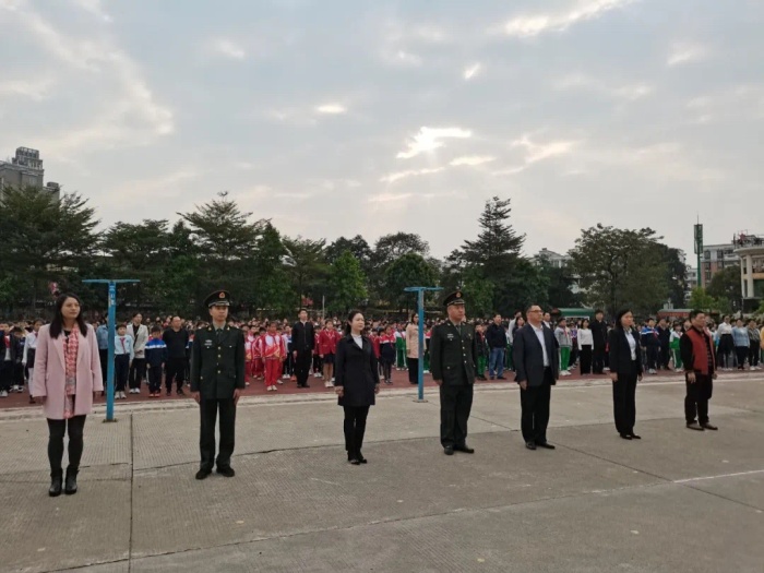 中山市港口鎮(zhèn)政府武裝部賀洪彪部長、港口新港社區(qū)仇曉媚書記、家長代表以及全校師生參加了主題升旗儀式。