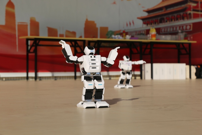 在莊嚴的升旗儀式結(jié)束后,科技節(jié)活動拉開了帷幕。首先,廣東省李余仙名師工作室港口鎮(zhèn)袁小玲工作坊合作科普團隊啟動了機器人表演。伴隨著歡快的音樂旋律,舞臺上一個個機器人手舞足蹈,吸引著臺下師生們的目光,歡快的氣氛渲染著整個校園。