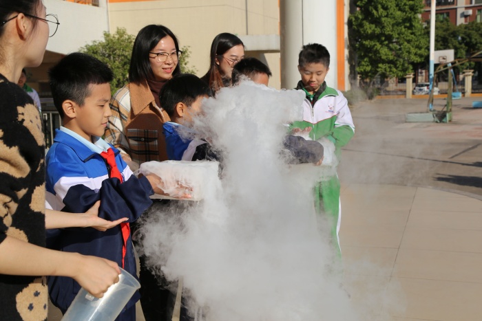 隨后,老師們帶來了一場精彩紛呈的科學實驗秀?!鞍谆ㄗ兗t花”小實驗讓孩子們大開眼界,感受科學的神奇魅力?!罢粕匣鹧妗备且俗⒛浚终浦猩鸬幕鹧孀尯⒆觽凅@嘆不已,嘖嘖稱奇,點燃了孩子們對科技節(jié)的熱情。“神奇的干冰秀”讓學生代表親身體驗了“騰云駕霧”的情境,大家在歡呼聲中對科學探究產(chǎn)生了更大的興趣與熱情。孩子們在歡聲笑語中了解科學原理,增長科學知識。