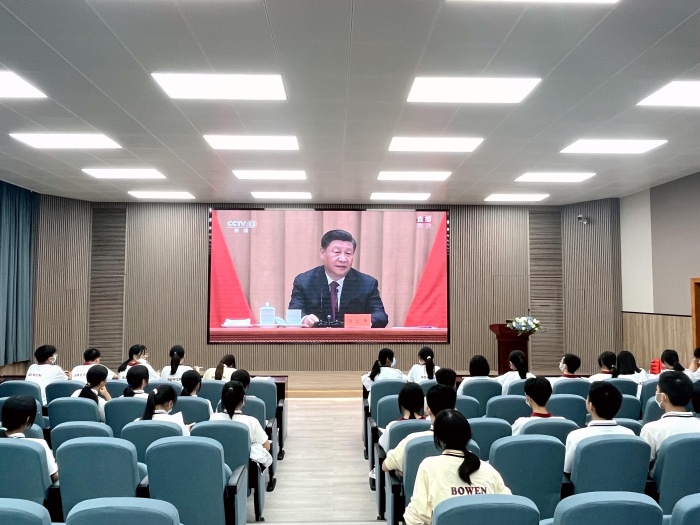 越百年櫛風(fēng)沐雨,綻芳華乘風(fēng)破浪。今年是中國共產(chǎn)主義青年團成立100周年,慶祝大會在北京人民大會堂隆重舉行。中共中央總書記、國家主席、中央軍委主席習(xí)近平出席大會并發(fā)表重要講話。廣東博文學(xué)校初、高中部共同組織團員以及入團積極分子在綜合樓407觀看本次建團100周年慶祝大會的現(xiàn)場直播。