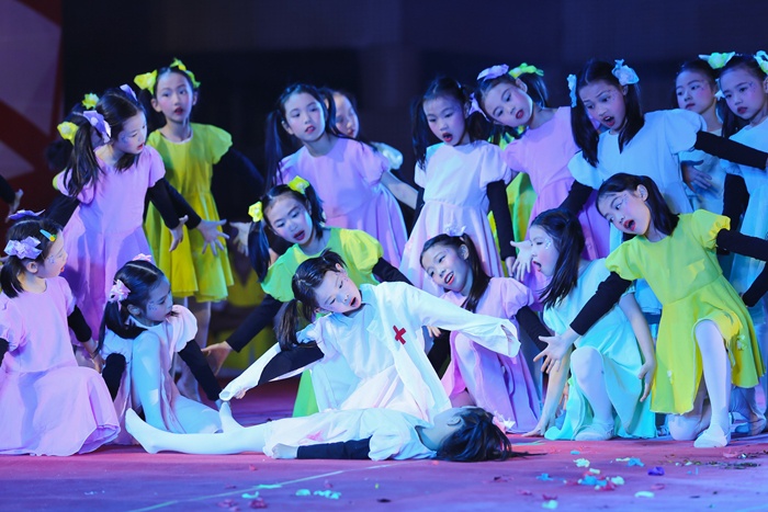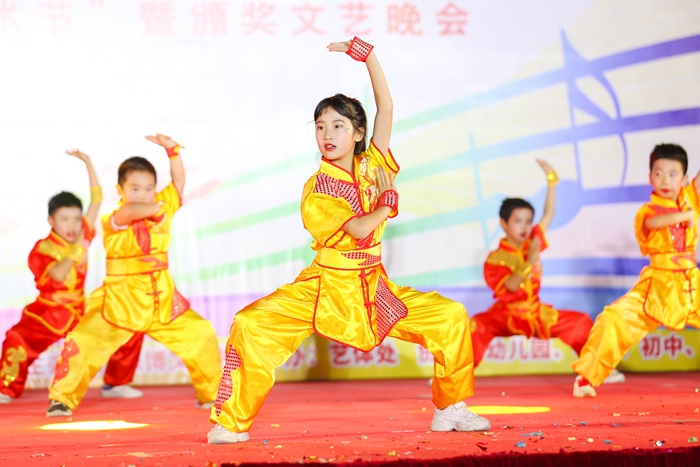 本次晚會主題鮮明,藝術(shù)形式豐富,分為夢想啟航、錦繡前程、青春飛揚三個篇章,共15個節(jié)目。管樂合奏《國際歌》《GOODTIME》氣勢恢宏,奪人心魄;歌曲聯(lián)唱《從這里開始》以多種演唱方式歌唱青春的美好、歌唱祖國的繁榮富強;舞蹈《童年的夢想》《我們都是小星星》《甜甜棒棒糖》的小演員們以活潑可愛的舞蹈展現(xiàn)著對祖國的熱愛;民樂合奏《金蛇狂舞》將中國傳統(tǒng)樂器的魅力呈現(xiàn)得淋漓盡致;激情四溢、熱血澎湃的爵士舞《pingpang》,腳步輕快、節(jié)奏分明的拉丁舞《綻放我的青春》,風(fēng)格獨特、輕盈曼妙的古典舞《象山水月》等一一上演。此外,《最炫運動梯臺秀》、電聲樂隊《海闊天空》、武術(shù)表演《威武少年中國夢》等豐富多樣的節(jié)目更是精彩紛呈,引發(fā)觀眾強烈的情感共鳴,現(xiàn)場掌聲不斷,激動的歡呼聲此起彼伏。