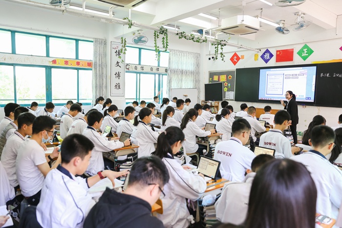 初中部安排了下午第一節(jié)課語、數(shù)、英、史、生五個學(xué)科的公開課。上課教師依托平板開展智慧課堂高效教學(xué),為來訪教師呈現(xiàn)了五堂別具一格、生動高效的觀摩課。課堂上精彩紛呈,學(xué)生們收獲滿滿,聽課教師受益匪淺。聽課結(jié)束后,各位教師來到交流室,就智慧課堂如何利用平板進行課前備課、課堂教學(xué)、課后服務(wù)等問題進行了討論交流。