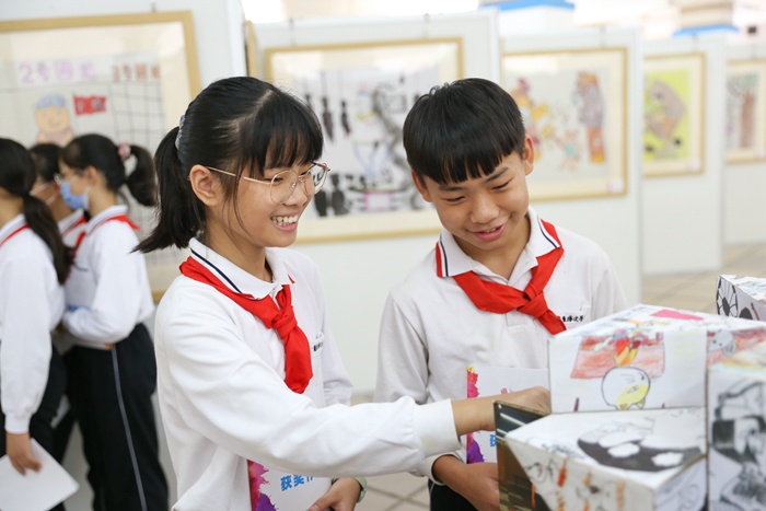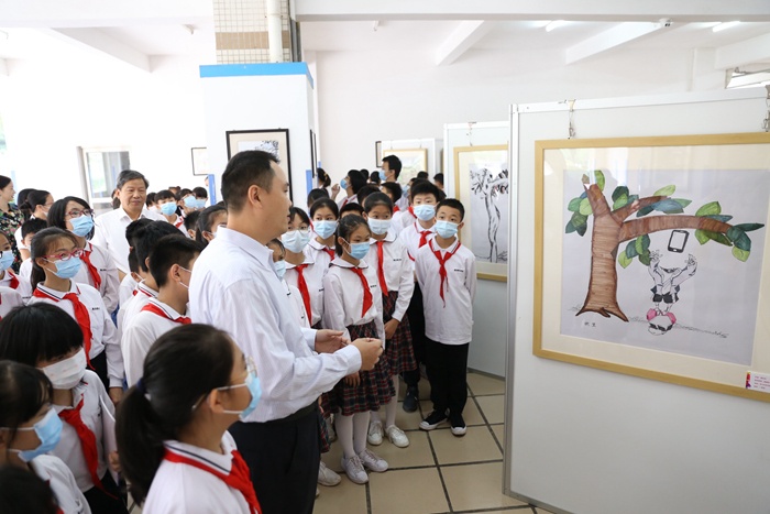 在開幕式上,中山市婦女兒童活動中心副主任陽艷峰表示:舉辦漫畫比賽,同學(xué)們參與其中,在展覽中看到孩子放飛自我的想象力和橫涂豎抹的動手能力,領(lǐng)略漫畫的魅力。小學(xué)部徐曙校長對領(lǐng)導(dǎo)嘉賓們的到來表示熱烈歡迎并介紹了學(xué)校的“六個(gè)陪伴”培養(yǎng)目標(biāo),開設(shè)幾十門選修課培養(yǎng)學(xué)生藝術(shù)愛好,希望通過本次漫畫獲獎(jiǎng)作品巡展能激勵(lì)更多的同學(xué)加入到漫畫創(chuàng)作中來。學(xué)生代表吳美林表示:“很高興認(rèn)識到幽默諷刺漫畫的表現(xiàn)方法和內(nèi)涵,漫畫創(chuàng)作的種子和中山優(yōu)秀漫畫文化的作品讓自己獲益良多,希望漫畫比賽活動每年都舉辦!”