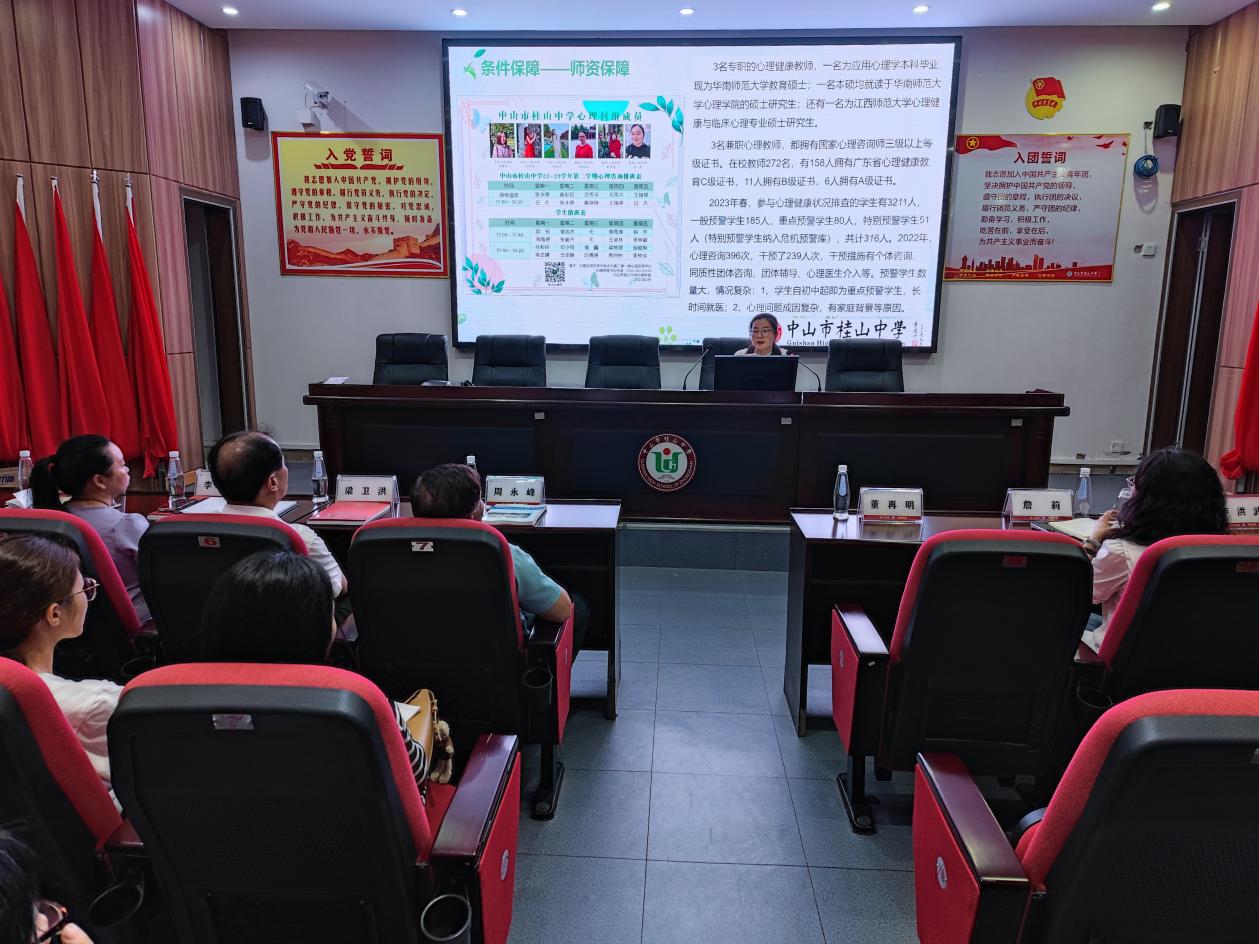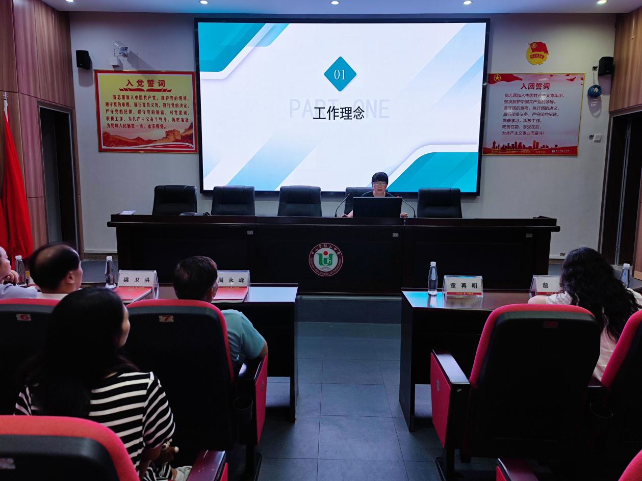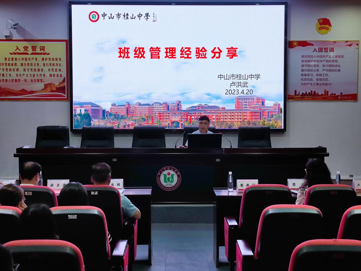 接著,來訪嘉賓移步學(xué)校育賢樓一樓黨員活動室,做進一步的交流探討。桂山中學(xué)董再明校長播放了學(xué)校宣傳片,從學(xué)?;厩闆r、發(fā)展歷程、教育理念、辦學(xué)特色等方面向來訪嘉賓作了介紹。德育處羅誠副主任對年級德育管理理念、工作策略和實踐做了經(jīng)驗分享。盧洪武老師分享了班級特色文化創(chuàng)建、特色主題班會實踐活動和班級凝聚力形成的經(jīng)驗。王婭婷老師對心理健康教育工作特色進行了聲情并茂的分享。