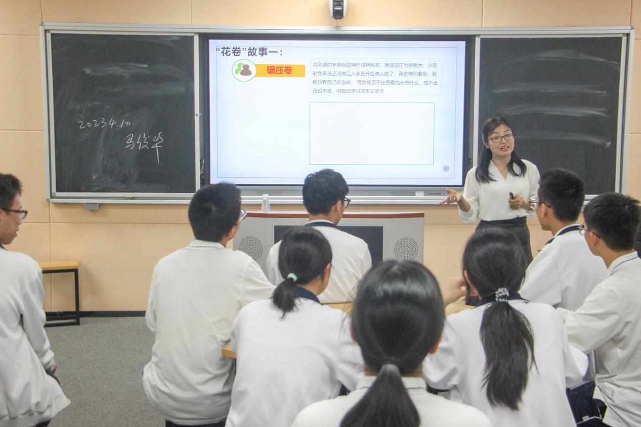 班會觀摩課上,馬老師以一個問題“你會選擇誰來做同桌?”開啟“碾壓卷”“背后卷”和“卷心菜”三個情景故事,引導(dǎo)學(xué)生發(fā)現(xiàn)三個故事的共同點,揭示“卷”的本質(zhì),并啟發(fā)學(xué)生以成長思維來認識學(xué)習(xí),不用學(xué)習(xí)定義自己,認識到大腦的可塑性。同時,介紹“自我對話練習(xí)”,希望同學(xué)們通過積極的自我對話,接受積極的暗示,從而幫助學(xué)生從“躺不平、卷不贏”的內(nèi)耗狀態(tài)里解放出來。課堂上,學(xué)生們積極參與,與馬老師互動頻繁,觀摩的老師們也認真觀看、做筆記。