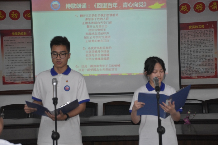 2022年新團(tuán)員入團(tuán)儀式正式結(jié)束后,團(tuán)員代表高二6班羅子謙、高一8班楊樂帶來詩歌朗誦《回望百年,青心向黨》,表達(dá)了對(duì)“五四”運(yùn)動(dòng)的深刻紀(jì)念。