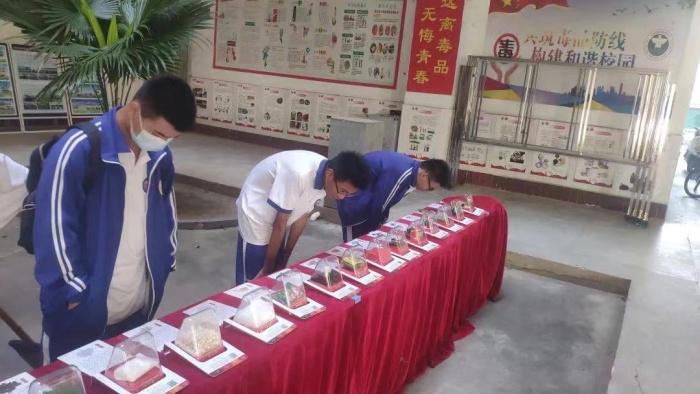 隨后,林警官通過一系列圖片,向同學們展示了常見的毒品及其辨識方法。其中,傳統(tǒng)毒品包括鴉片、海洛因、罌粟殼、大麻、病毒、搖頭丸和麻古、阿拉伯茶、干花和紅冰;還有一些常見的新型毒品包括奶茶、浴鹽、開心水、止咳水、跳跳糖、神仙水和郵票毒品。林警官通過對這些毒品的成分、外觀和吸食后果進行介紹,讓同學們直觀地學會辨識毒品、更深刻地認識到毒品的危害性、成癮性和非法性。