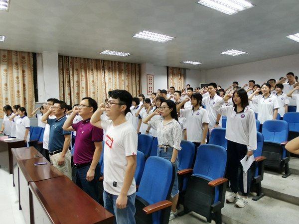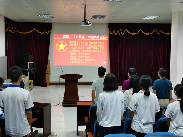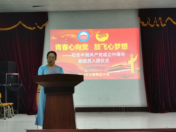為慶祝中國(guó)共產(chǎn)黨建黨99周年,熱情謳歌黨的光輝業(yè)績(jī),繼承和發(fā)揚(yáng)黨的光榮傳統(tǒng)和優(yōu)良作風(fēng),認(rèn)真學(xué)習(xí)習(xí)近平總書(shū)記有關(guān)重要講話(huà)精神,教育和引導(dǎo)青年學(xué)生在奮斗中釋放青春激情、追逐青春理想、凝聚青春力量,勇?lián)鷷r(shí)代重任,以實(shí)際行動(dòng)響應(yīng)上級(jí)號(hào)召,近日,中山市古鎮(zhèn)高級(jí)中學(xué)校團(tuán)委在學(xué)校報(bào)告廳舉辦了慶祝建黨99周年新團(tuán)員入團(tuán)儀式。譚杰玉副校長(zhǎng)、王學(xué)智主任、孔慶軍書(shū)記、符贑強(qiáng)副書(shū)記、黃荷艷老師、青年教師代表、全體新團(tuán)員及高一高二各班團(tuán)干部參加了會(huì)議,黃荷艷老師主持會(huì)議。