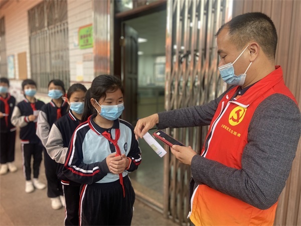 下午兩點(diǎn)半,核酸檢測工作井然有序,學(xué)生體溫檢測后,在班主任的帶領(lǐng)下有序地排好隊(duì)。黨員教師認(rèn)真做好配合檢測人員的工作,全程引導(dǎo)學(xué)生保持一米間距,協(xié)助檢測人員核對(duì)檢測名單,不漏一人,不錯(cuò)一人。采樣采取10人一組,按照班級(jí)的順序有序地進(jìn)行檢測。醫(yī)護(hù)工作人員不辭辛苦、用最專業(yè)的技術(shù)、最快的速度,讓家長安心,讓學(xué)校放心,為筑牢校園安全增加一道“防護(hù)墻”。
