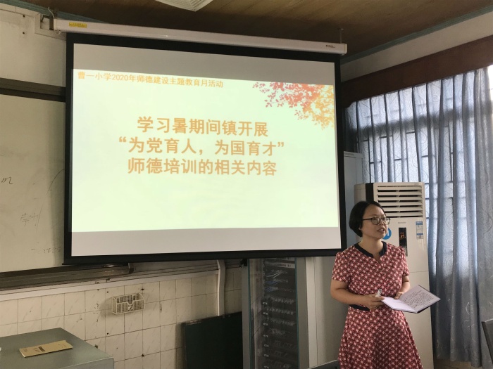 第三個議程,古主任帶領(lǐng)大家一起學習了古鎮(zhèn)鎮(zhèn)在暑假期間開展“為黨育人,為國育才”師德培訓的相關(guān)內(nèi)容。古主任先帶著大家重溫了師德的基本內(nèi)涵(三愛兩人一終身),接著和大家一起了解古鎮(zhèn)鎮(zhèn)這五年來師德建設(shè)的現(xiàn)狀,最后古主任用匡書記提出的五點具體要求,激勵在場的全體老師向師德高尚的老師學習,爭做德藝雙馨的曹一教育人!