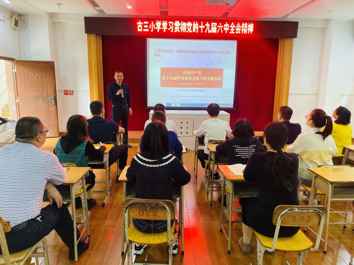 中國共產(chǎn)黨第十九屆中央委員會第六次全體會議于11月8日至11日在北京召開。古三小學(xué)全體黨員紛紛通過電視、電腦、手機、學(xué)習強國等媒介自主學(xué)習全會公報。11月15日上午古三小學(xué)召開“深悟百年成就 開創(chuàng)美好未來”——學(xué)習貫徹黨的十九屆六中全會精神專題學(xué)習會。