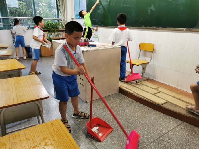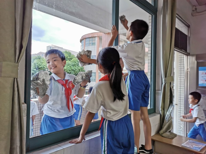 教學樓內由各班分別負責相應的教室和公共地區(qū)。教學樓四周校道由高年級學生自備勞動工具進行打掃。在各位老師的指揮和參與下,大家干勁十足,積極熱情地完成了各項勞動任務,從教室到功能室,再到各班的包干區(qū),深入校園的每個角落。同學們有的在抹窗戶、課桌椅、投影機、電腦柜、圖書柜,有的在打掃包干區(qū)的綠化地帶等場所,大家干得熱火朝天,整個大掃除活動井然有序地進行著。