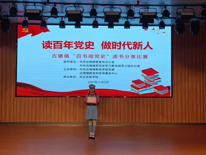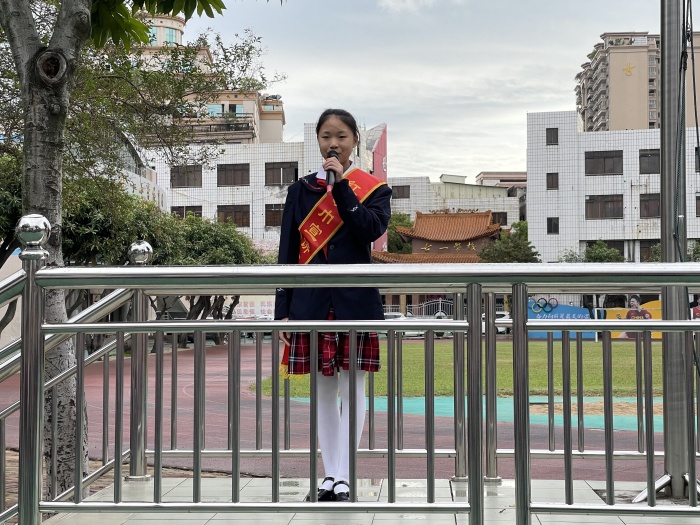 百年風(fēng)雨兼程,世紀(jì)滄桑巨變。為慶祝中國共產(chǎn)黨成立100周年,引導(dǎo)廣大少先隊員愛黨、愛祖國,傳承紅色基因,扣好人生第一粒扣子,古鎮(zhèn)鎮(zhèn)教育事務(wù)指導(dǎo)中心舉行了中小學(xué)生黨史閱讀分享比賽活動,古一小學(xué)六1班的左欣妮同學(xué)參加本次活動以出色的表現(xiàn)榮獲特等獎。近日,左欣妮站到學(xué)校升旗臺上,與全體同學(xué)再次分享她的黨史閱讀故事——《揚(yáng)愛國情懷 抒赤子之心》。