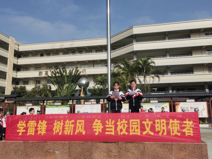 在升旗儀式上,六(3)班劉悅和姚沁彤同學(xué)向全體同學(xué)發(fā)出倡議:1、爭(zhēng)做文明城市的小主人。2、爭(zhēng)做關(guān)愛他人的小使者。3、爭(zhēng)做嚴(yán)于律己的小標(biāo)兵。4、爭(zhēng)做勤儉節(jié)約的小模范。5、爭(zhēng)做發(fā)揚(yáng)“釘子精神”的小勇士。讓雷鋒精神在大家手中薪火相傳,常傳常新。