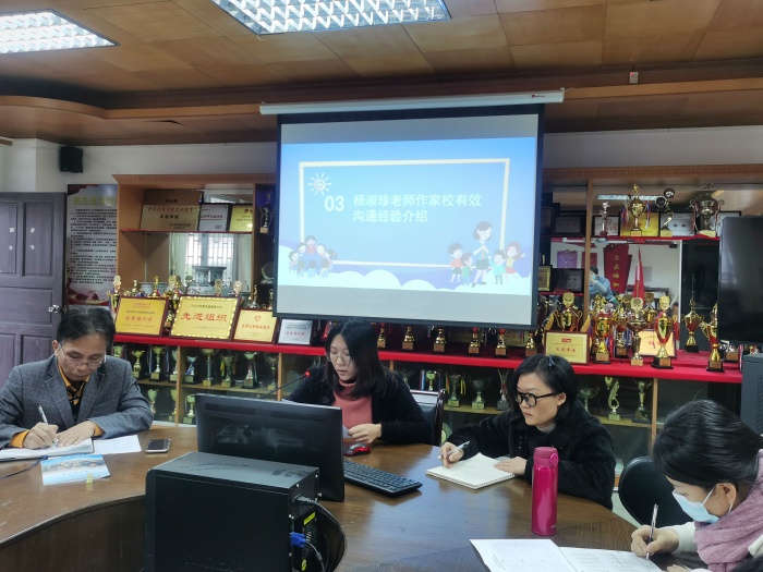 第一議程是由三位班主任進行經(jīng)驗分享。先由王金星老師進行特色班級創(chuàng)建匯報。金星老師圖文并茂地向班主任們展示他創(chuàng)建特色班的歷程、班級特色成果和創(chuàng)建感受,他的展示,讓班主任們真真切切地感受到金星老師特色班創(chuàng)建工作的用心。接著由經(jīng)驗豐富的袁秀歡老師進行早讀、午練、包干區(qū)管理經(jīng)驗介紹,她把多年積攢的帶領班級的經(jīng)驗向班主任們進行了詳細的講述,班主任們用心聆聽,時不時還不住地點頭認同。最后由新手班主任楊淑珍老師向班主任們進行家校溝通經(jīng)驗交流,楊老師獨到的、新穎的教育管理方式讓班主們耳目一新,受益匪淺。