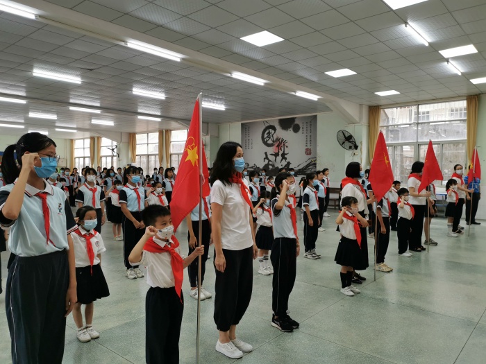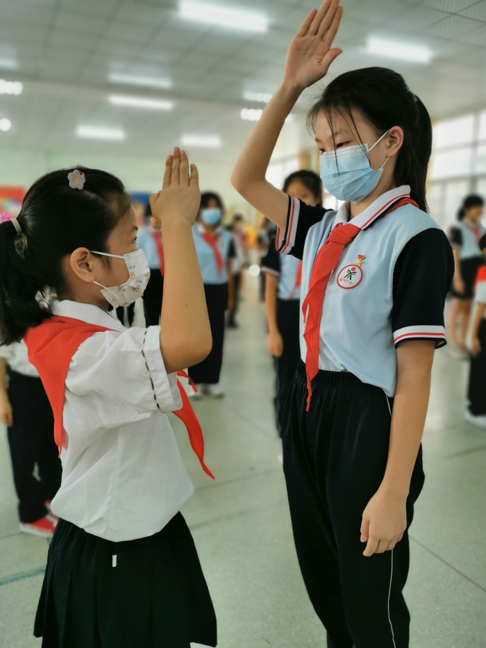 在少先隊輔導員助理巫老師帶領(lǐng)下,同學們舉起右拳,高聲呼號,表達做共產(chǎn)主義新時代接班人的決心。