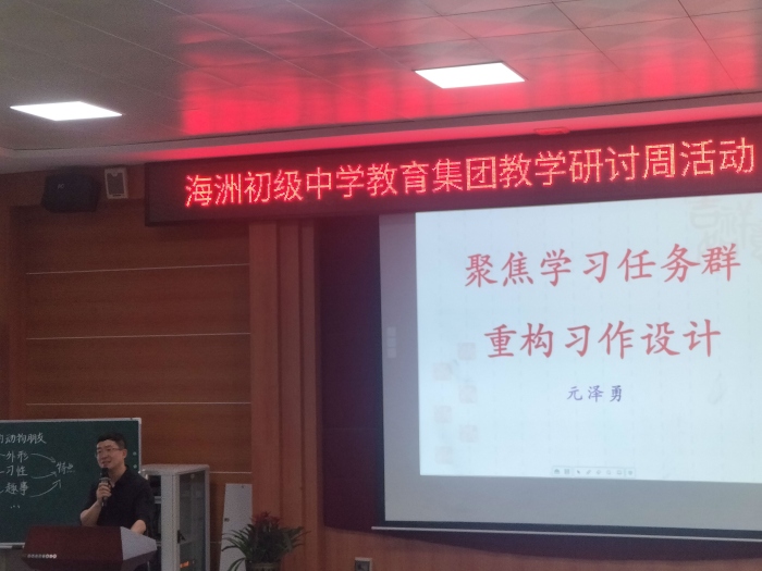 緊接著,鎮(zhèn)語(yǔ)文教研組長(zhǎng)元澤勇主任帶來題為“聚焦學(xué)習(xí)任務(wù)群、重構(gòu)習(xí)作設(shè)計(jì)”的講座。元老師從課例評(píng)價(jià)出發(fā),對(duì)于在作文教學(xué)中如何設(shè)計(jì)任務(wù)群,如何引導(dǎo)學(xué)生言語(yǔ)實(shí)踐,作了一場(chǎng)精彩的講座。