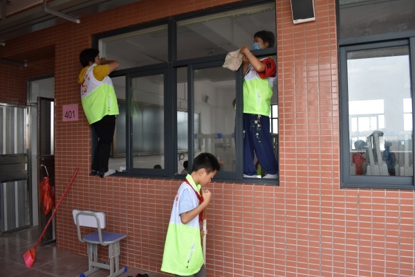 由于裝修工程遺留的灰塵較多,清潔任務(wù)繁重,雖是烈日當(dāng)空,仍然阻擋不了大家的熱情和腳步,每一個人都在自己的清潔區(qū)域內(nèi)恪盡職守,揮灑著勞動的汗水。老師們、家長們肩負(fù)起高難度工作,細(xì)心擦拭著高層窗戶,安裝教室窗簾,清潔帶有頑固污漬的死角。學(xué)生們勁頭十足,紛紛拿起自帶的抹布和掃把,二話不說開始干了起來。一雙雙小手將玻璃窗擦得明亮潔凈,把教室的桌椅擺放地整整齊齊,甚至不放過教室大門的每一處縫隙,那勞動的熱情使得胸前的紅領(lǐng)巾更加鮮艷。