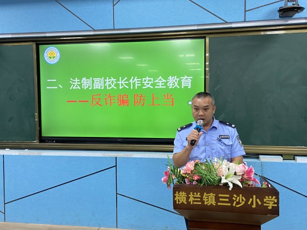 典禮上,三沙小學的法制副校長從“交通安全”、“防火安全”、“防溺水安全”、“網(wǎng)絡安全”、“毒品安全”等方面對全體師生進行假期的安全教育,提醒同學們在假期要提高安全法制意識,提高明辨是非、遠離犯罪、自我防范的能力,要求同學們以法律來規(guī)范自己的思想,用規(guī)則來約束自己的行為,做一個遵紀守法的好孩子,過一個平安快樂的假期。