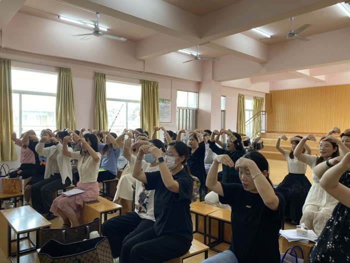 本次活動共分成三個環(huán)節(jié)。首先由橫欄中學已順利通過預備級考核的謝小瑩老師作為領(lǐng)學人帶領(lǐng)全體音樂教師練習“音樂教師柯達伊教學法能力水平測評——預備級”的測評內(nèi)容。大家在謝小瑩老師的指導下逐項練習單聲部首調(diào)視唱、二聲部視唱、節(jié)奏卡農(nóng)、柯達伊體系的手勢運用、五聲調(diào)式的轉(zhuǎn)調(diào)及中國民歌演唱。