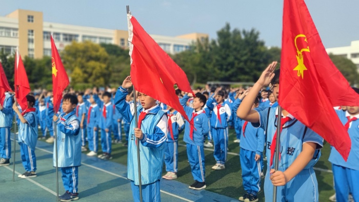 隨著主持人韋林依依的登場(chǎng),少先隊(duì)出隊(duì)旗,隊(duì)員們隊(duì)列整齊,精神飽滿(mǎn);旗手英姿颯爽,軍姿端莊;鮮艷的五星紅旗冉冉升起在校園上空。全體隊(duì)員們帶著對(duì)祖國(guó)的崇敬和祝福,高唱中華人民共和國(guó)國(guó)歌和《中國(guó)少年先鋒隊(duì)隊(duì)歌》。