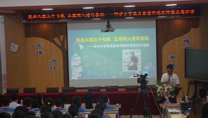 為弘揚(yáng)人民教師教書育人的高尚品格,進(jìn)一步提升教師的幸福感,增強(qiáng)教師的使命感和責(zé)任感,激發(fā)學(xué)生尊師之情,2022年7月1日下午,四沙小學(xué)舉行了“熱血從教三十七載 立德樹人譜寫春秋”梁月金老師退休師德主題活動(dòng)。活動(dòng)主會(huì)場(chǎng)在階梯室,其他班級(jí)通過釘釘直播收看。