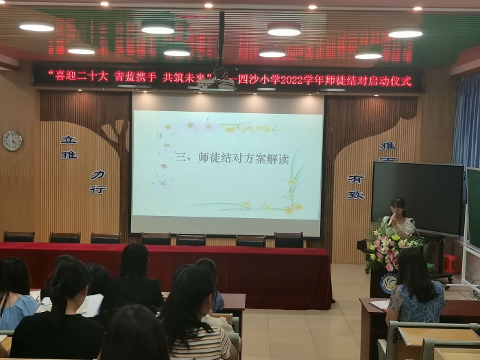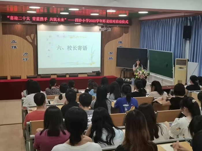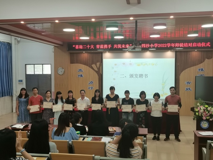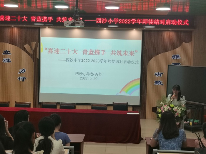 為了進一步提升學校辦學水平,提高新教師的教育教學能力,促進教師團隊協(xié)調(diào)、高質(zhì)量發(fā)展,2022年9月20日下午,四沙小學在階梯室舉行了2022-2023學年師徒結(jié)對啟動儀式,教務處全體成員、相關師徒結(jié)對教師參加了會議。會議由教務處副主任黃麗芬主持。