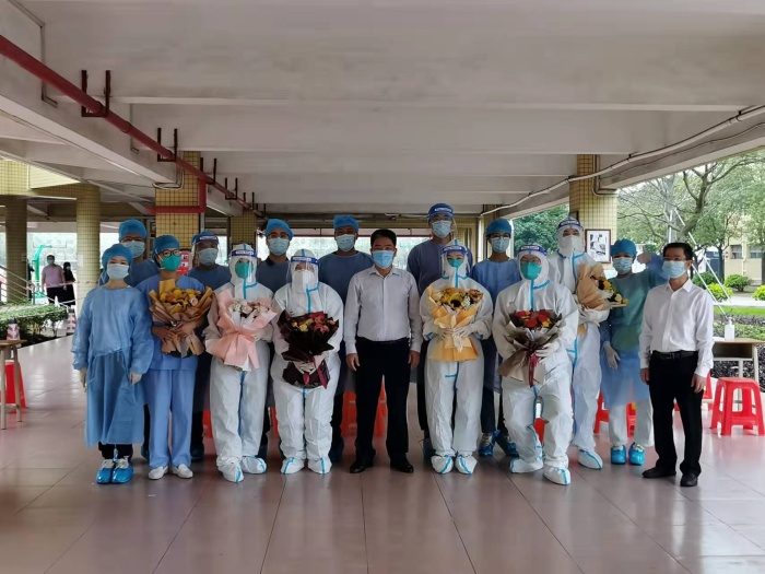 在檢測工作正式開始前,為了表達對辛勤奮戰(zhàn)在抗疫一線醫(yī)護人員的敬佩并感謝全體醫(yī)護人員一直以來對學校工作的支持和關心,學校借此機會舉行了簡單而隆重的獻花儀式。橫欄中學黨總支書記、校長黎碧東為每一位參與學校核酸檢測的醫(yī)護人員敬獻了鮮花,并同大家一起合影留念。