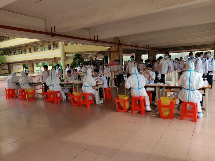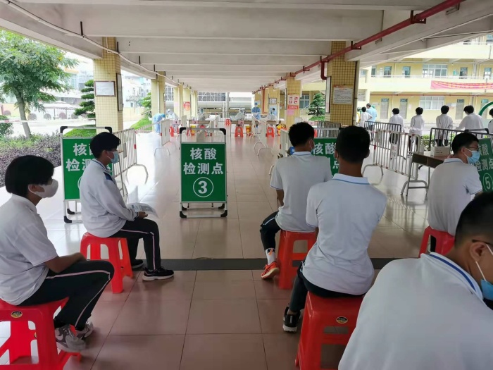 橫欄中學參加本次核酸檢測的學生共有3000多人,分初三、初二、初一三個批次,共6條檢測通道,依次開展檢測。在參加檢測前,學校相關部門和班主任做了大量的準備工作,提前收集好了學生的葵花碼,劃定了進場路線、排隊區(qū)、待檢區(qū)、檢測區(qū)等區(qū)域,大大保證了現(xiàn)場的安全、有序、高效。同時,學校很多黨員干部、教師、后勤人員也加入到志愿者隊伍中,協(xié)助維護現(xiàn)場秩序、查驗核酸碼、核酸檢測信息錄入等工作,現(xiàn)場工作氣氛熱烈,大家都十分投入!