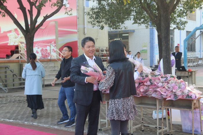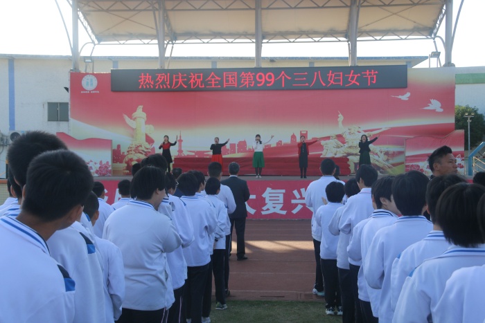 上午7點(diǎn)30分,全校師生集中運(yùn)動(dòng)場(chǎng),在《鏗鏘玫瑰》的歡快音樂聲中,三個(gè)年級(jí)的全體女教職工,走過紅地毯,走上主席臺(tái),接受學(xué)校領(lǐng)導(dǎo)的鮮花與祝福。