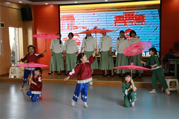 接著,與會老師共同欣賞了升輝小學(xué)師生帶來的傳統(tǒng)節(jié)目展演。展演上,童聲手勢舞演繹中華孝道;吟誦社團(tuán)的吟詠?zhàn)屓巳绨V如醉;低年級師生的《粵童謠》仿佛把大家?guī)У絻簳r無憂無慮的日子;中高年級的情景劇帶著大家穿越到宋朝,感受蘇軾的瀟灑。