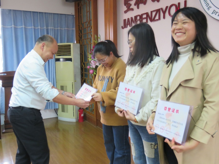 培紅小學的班主任、輔導員隊伍表現(xiàn)出色,在上個學期獲獎不少,碩果累累!梁惠鵬校長為她們一一頒獎。其中潘佩芬老師獲2020-2021年度“黃圃鎮(zhèn)光榮在崗二十年少先隊輔導員”稱號,冼煒賢老師、梁桂珍老師獲2020-2021年度“黃圃鎮(zhèn)光榮在崗十年少先隊輔導員”稱號。賴金玲老師獲得2020年“淬煉師德師能,踐行育人使命”師德主題征文活動中,獲小學組三等獎。梁桂珍老師、郭鳳珍老師、吳敏濤老師獲2020-2021年度“黃圃鎮(zhèn)優(yōu)秀少先隊輔導員”稱號。