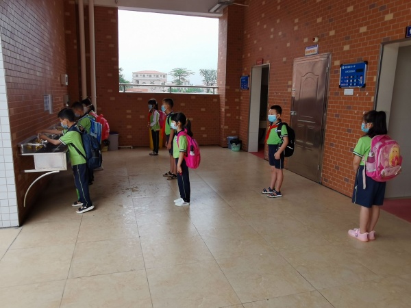 早晨七點,學(xué)校行政人員和全體教職工各司其職,在不同崗位等候吳欄小學(xué)學(xué)子們歸來。校園門口體溫監(jiān)測通道準時開啟,同學(xué)們按照學(xué)校報到要求,陸續(xù)錯峰返校。他們佩戴口罩,根據(jù)地面標示線,有序間隔一米距離排隊。負責(zé)體溫檢測的老師逐一檢測同學(xué)們的體溫,測溫正常的同學(xué)們回到班級所在樓層洗手處進行洗手,只見同學(xué)們認真地按照“七步洗手法”洗刷他們的稚嫩的小手,然后按照指定通道進入教室。