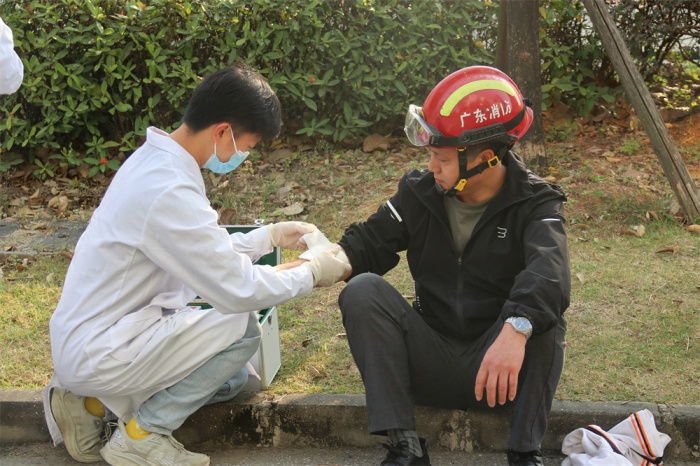 早上8點(diǎn)10分,校園響起消防警報(bào)。短短4分鐘時(shí)間內(nèi),全校師生按照事先規(guī)劃好的逃生路線,立即從各樓層緊張有序地疏散到學(xué)校運(yùn)動(dòng)場(chǎng),并迅速整隊(duì),清點(diǎn)人數(shù)上報(bào)指揮部。同時(shí)消防救援大隊(duì)到場(chǎng)成功處置火情,并救出被困師生。校醫(yī)楊醫(yī)生對(duì)模擬傷員教師進(jìn)行包扎處理。