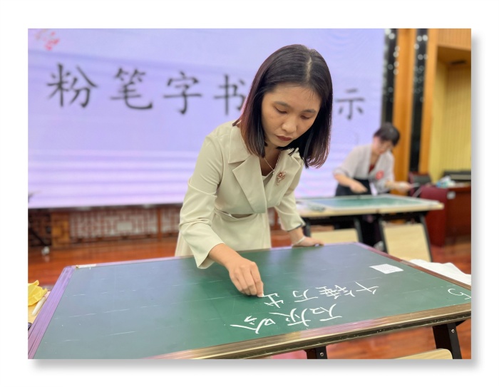 寫好粉筆字是教師基本素養(yǎng)的體現(xiàn),語文課堂上,教師一手好的粉筆字能充分展現(xiàn)漢字的形態(tài)之美,引導(dǎo)學(xué)生學(xué)好漢字。教師們需在5分鐘內(nèi)統(tǒng)一書寫明代詩人于謙的《石灰吟》。只見她們從容鎮(zhèn)定,即席揮毫,不一會(huì)兒一個(gè)個(gè)規(guī)范方正、筆力勁挺的粉筆字便躍然黑板。作品有的飄逸瀟灑,有的精致流暢,有的靈動(dòng)生趣。一幅幅精美的作品,體現(xiàn)了教師們扎實(shí)的基本功。