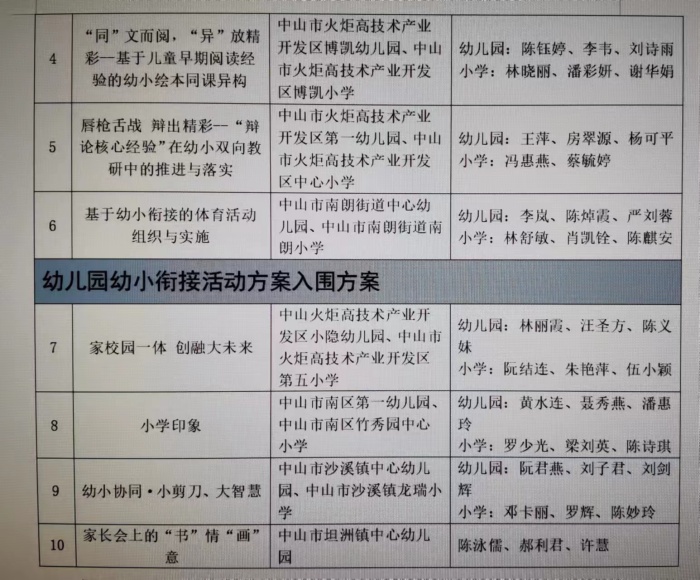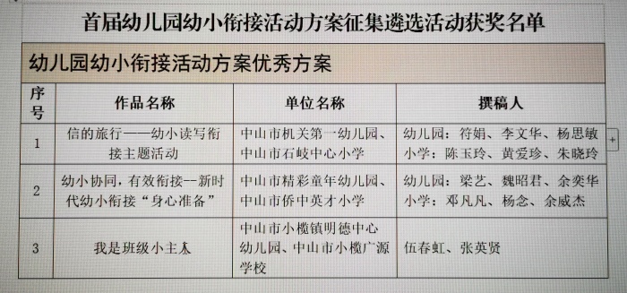 2023年5月5日,在廣東省教育廳公布的《廣東省首屆幼兒園自主游戲活動案例和幼小銜接活動方案征集遴選結(jié)果》中,中山市有12個自主游戲活動案例和10個幼小銜接案例榜上有名。據(jù)了解,全省共遴選出自主游戲活動優(yōu)秀案例86篇,入圍案例138篇;幼小銜接活動優(yōu)秀方案80篇,入圍方案145篇。中山市此次選送自主游戲活動案例15個,其中6個獲評優(yōu)秀案例,6個獲評入圍案例;選送幼小銜接活動方案15個,其中6個獲評優(yōu)秀方案,4個獲評入圍方案(獲獎名單見附件)。
