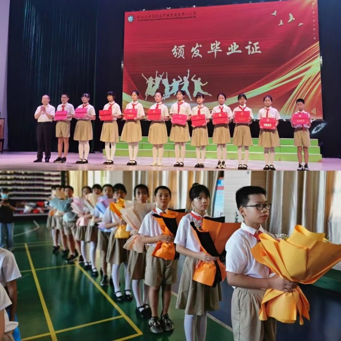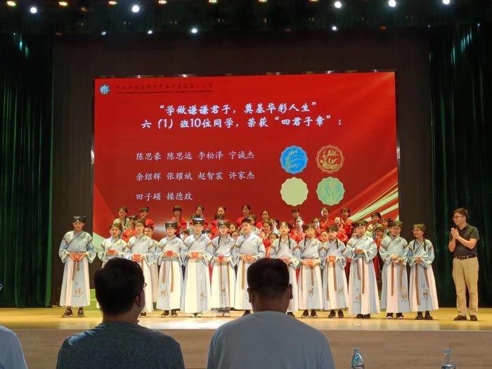 接下來,學校領導為畢業(yè)生頒發(fā)畢業(yè)證書并對優(yōu)秀畢業(yè)生進行表彰,頒發(fā)最高榮譽“謙謙君子”章、“少年君子”章和“四君子”章,獎章熠熠,莊重熱烈,表彰激勵,催人奮進。每一位畢業(yè)生的臉龐都洋溢著幸福的微笑,為絢爛的小學生活畫上圓滿的句號。