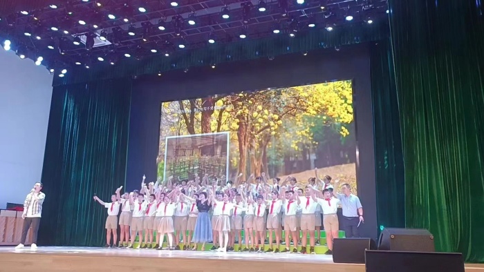 六(1)班覃詩涵爸爸作為家長代表給母校獻詞,他感謝各位老師在同學們人生啟航的路上,作為燈塔指引同學們前進的方向,教會同學們用理想做帆,堅強做槳,知識做舵,砥礪前行。最后祝福全體同學前塵錦繡,一路凱旋!