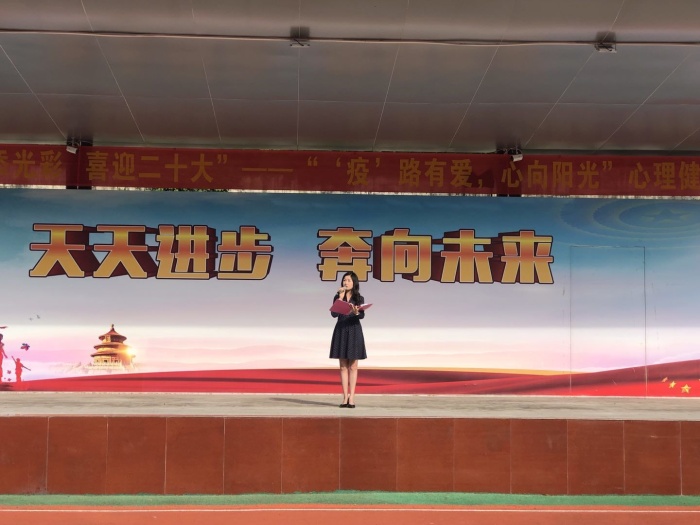德育副校長馮麗芬在開幕儀式上向全體師生介紹、宣傳了心理健康的重要性,并用谷愛凌逆境奇襲的故事勉勵師生要積極向上,號召師生一起從思想上重視心理健康、行動上促進心理健康,最后還分享了保持心理健康的小妙招。