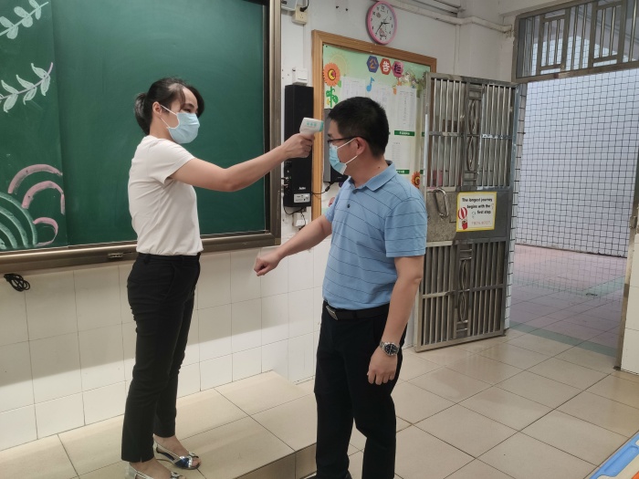 在上班時(shí)間,突發(fā)咳嗽并伴有發(fā)熱癥狀的老師立刻前往衛(wèi)生室。校醫(yī)對老師進(jìn)行近14天旅居史調(diào)查詢問、體溫復(fù)測和初步診斷,做好記錄后,立即上報(bào)學(xué)??傊笓]進(jìn)行應(yīng)急處理,并通知其家人或配合120將其送到定點(diǎn)發(fā)熱門診及時(shí)就診,同步立即上報(bào)到社區(qū)、區(qū)教育事務(wù)指導(dǎo)中心等相關(guān)部門。