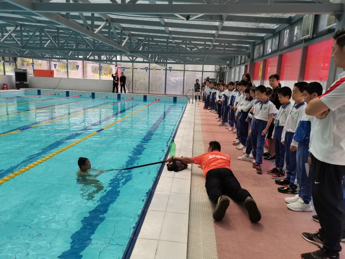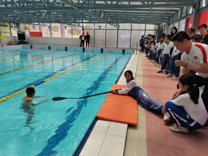 講座結(jié)束后,四4班的同學(xué)和老師來到恒溫游泳館,在教練員的現(xiàn)場講解和施救示范下,初步掌握了自救方法和施救方法。自救方法包括抓住周圍漂浮物,放松全身,讓身體漂浮在水面上,將頭部浮出水面,用腳踢水等。施救方法包括大聲呼救,找附近的大人求助;可以嘗試用木棍或繩子將溺水者拉至岸邊,但注意要保證自身的安全,可以趴在地上增加摩擦力,或者用障礙物做防護(hù)屏障,防止被反拖下水;為了爭取救援時(shí)間,還可以向溺水者拋擲木塊、塑料瓶等能漂浮于水面的物品,幫助他們保持在水面上呼吸;當(dāng)落水者離岸較遠(yuǎn)時(shí)應(yīng)尋找救生圈、救生繩、木板等拋向落水者等。