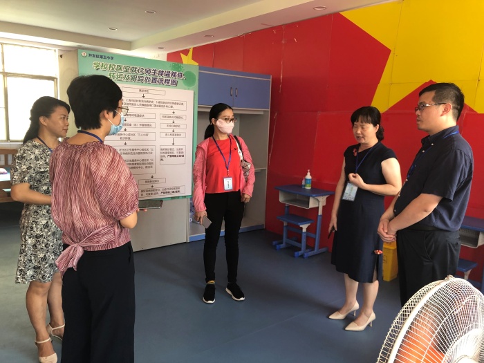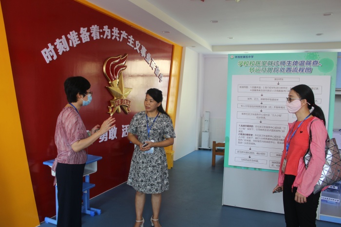 檢查組一行在胡冬梅副校長的帶領(lǐng)下對學校的開學準備、疫情防控、校園安全、規(guī)范管理以及師生返校等情況進行了資料的查看,詳細詢問,實地查看了校園環(huán)境、食堂、保健室、留觀室、防疫物資儲備室等區(qū)域,檢查組對學校的工作給予了肯定,并就進一步做好開學后秋季防疫工作提了建議,希望學校能進一步統(tǒng)一思想,加強常態(tài)化疫情防控管理,確保開學工作有序、安全、穩(wěn)定。