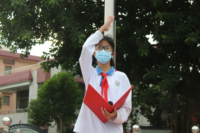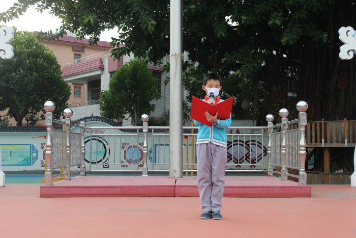 升旗儀式于7:50準(zhǔn)時(shí)開始。雄壯有力的《義勇軍進(jìn)行曲》響徹了整個(gè)校園,全體教師行注目禮、少先隊(duì)員行隊(duì)禮,全場彌漫著一種莊嚴(yán)肅穆的氣氛。升旗禮畢,在莊嚴(yán)的國旗下,四5中隊(duì)的隊(duì)員代表馮子明作了《牢記歷史 勿忘國恥 振興中華》的國旗下講話。