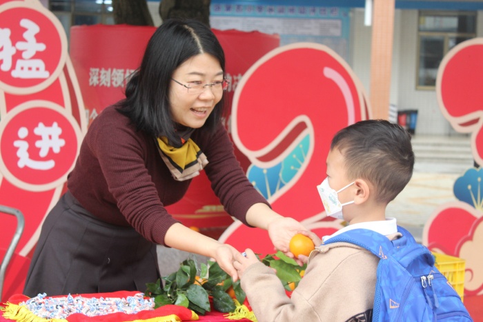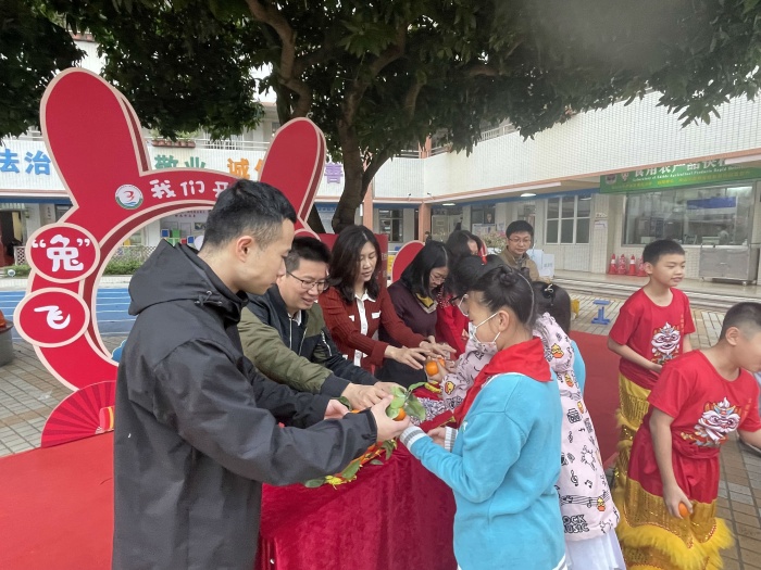 早上7時15分,學(xué)校行政攜同醒獅社團(tuán)、少先隊干部在校門口迎接學(xué)生返校,并為學(xué)生們送上桔子和大白兔糖,寓意五小學(xué)生在兔年“大吉大利”大展宏“兔”。