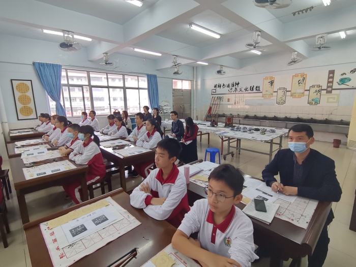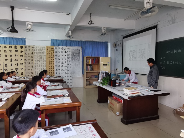 第一階段,首先由課題組成員李堆威老師進行書法課例展示——《奇正相成》,李老師由生活中的平衡圖片導(dǎo)入課題,再引導(dǎo)學(xué)生觀察“深”字的結(jié)構(gòu),相機總結(jié)軟筆書寫時要注意運筆方向、比劃位置以及部首之間穿插避讓的觀察方法。通過書法教育潛移默化地促進學(xué)生優(yōu)秀的品性,滲透書法教育培育學(xué)生優(yōu)秀品行的實施策略。