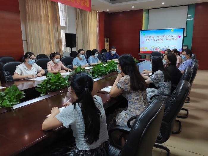 為深入貫徹落實(shí)省教育廳《關(guān)于轉(zhuǎn)發(fā)教育部大力推進(jìn)幼兒園與小學(xué)科學(xué)銜接指導(dǎo)意見(jiàn)》文件精神,建立幼兒園與小學(xué)科學(xué)銜接的長(zhǎng)效機(jī)制,促進(jìn)兒童德智體美勞全面發(fā)展和身心健康成長(zhǎng),近日,開(kāi)發(fā)區(qū)一幼聯(lián)合開(kāi)發(fā)區(qū)中心小學(xué)就幼小科學(xué)銜接工作開(kāi)展交流與研討,進(jìn)行了一次雙向?qū)W習(xí)與交流。開(kāi)發(fā)區(qū)教學(xué)部管理人員、大班級(jí)教師代表及開(kāi)發(fā)區(qū)中心小學(xué)教學(xué)副校長(zhǎng)、年級(jí)組長(zhǎng)及一年級(jí)教師代表參加了此次研討會(huì)。