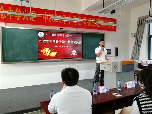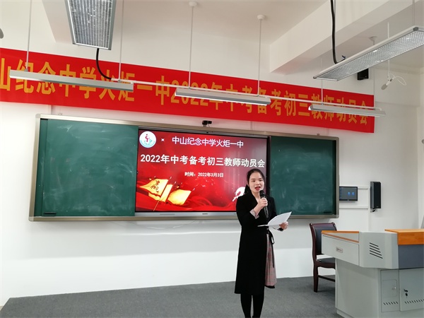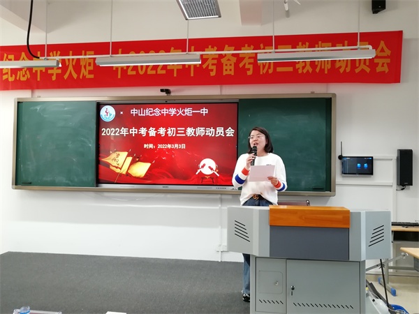 為激發(fā)初三教師中考備考的昂揚斗志,迎戰(zhàn)即將到來的中考,3月3日,中山紀念中學火炬一中舉行2022年中考備考初三教師動員會。校黨總支書記、副校長程煒敏及初三年級行政、教師參加會議?;鹁鎱^(qū)文體教育局副局長李建英、區(qū)教育事務指導中心股長詹必國出席會議。動員會由教導處副主任柏春菊主持。